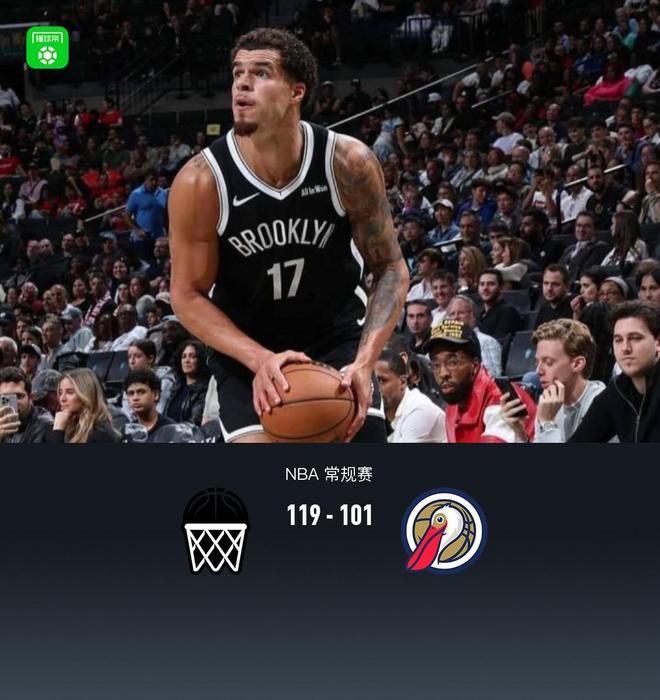 篮网119-101轻取鹈鹕,小波特35+9,克拉克斯顿三双,墨菲23分,